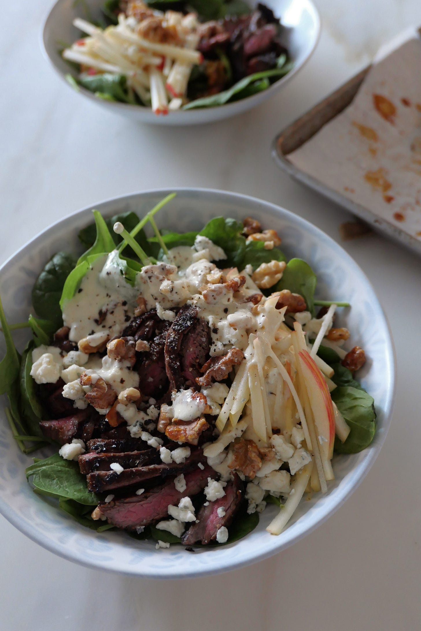 This salad was inspired by a meal I had at Jackson’s in Bend, Oregon. It was one of those dishes that felt both indulgent and fresh at the same time. Perfectly cooked steak, crisp greens, tart apple, a little blue cheese, and just enough sweetness from candied walnuts to pull everything together. It stuck with me after the trip, so I had to recreate it at home.